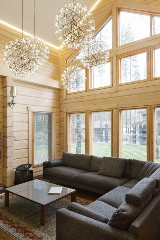Bay windows. Classic log homes are often symmetrical and built around the central bay window or glazed gable wall. Large windows and high ceilings create airy spaces filled with natural light, perfect for social activities or tranquil relaxation.